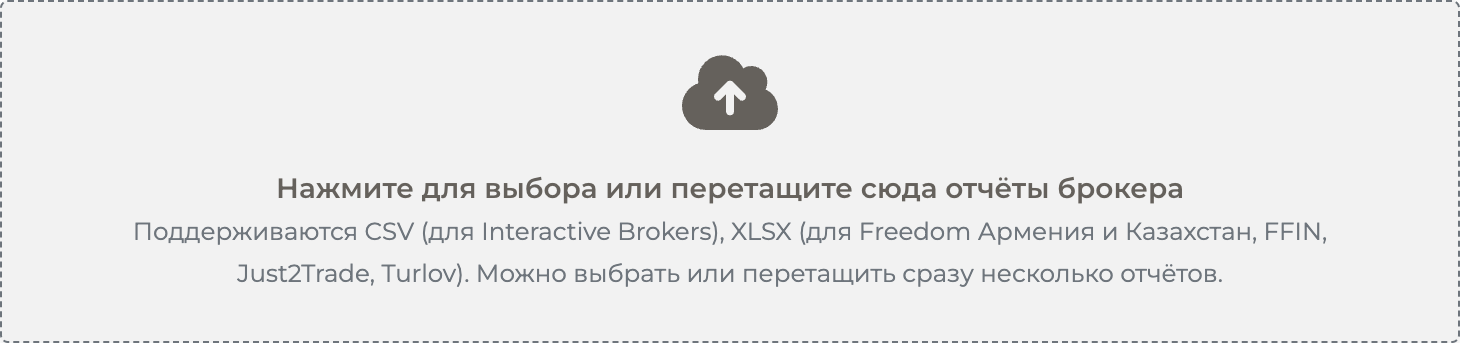 Перетащите файл(ы) с отчётом брокера в область с надписью «Нажмите для выбора или перетащите сюда отчёты брокера»