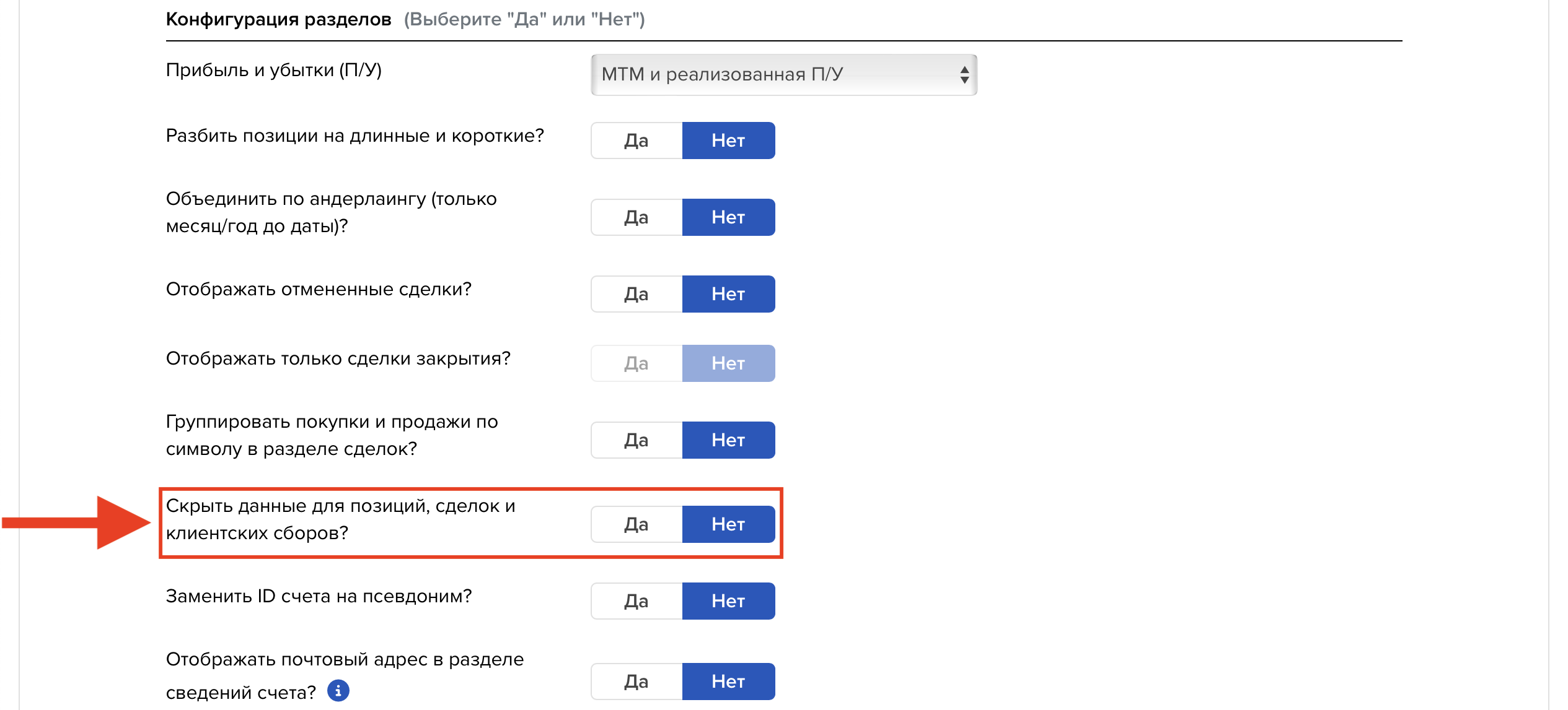 В блоке «Конфигурация разделов» («Section Configurations») ответьте на каждый из вопросов