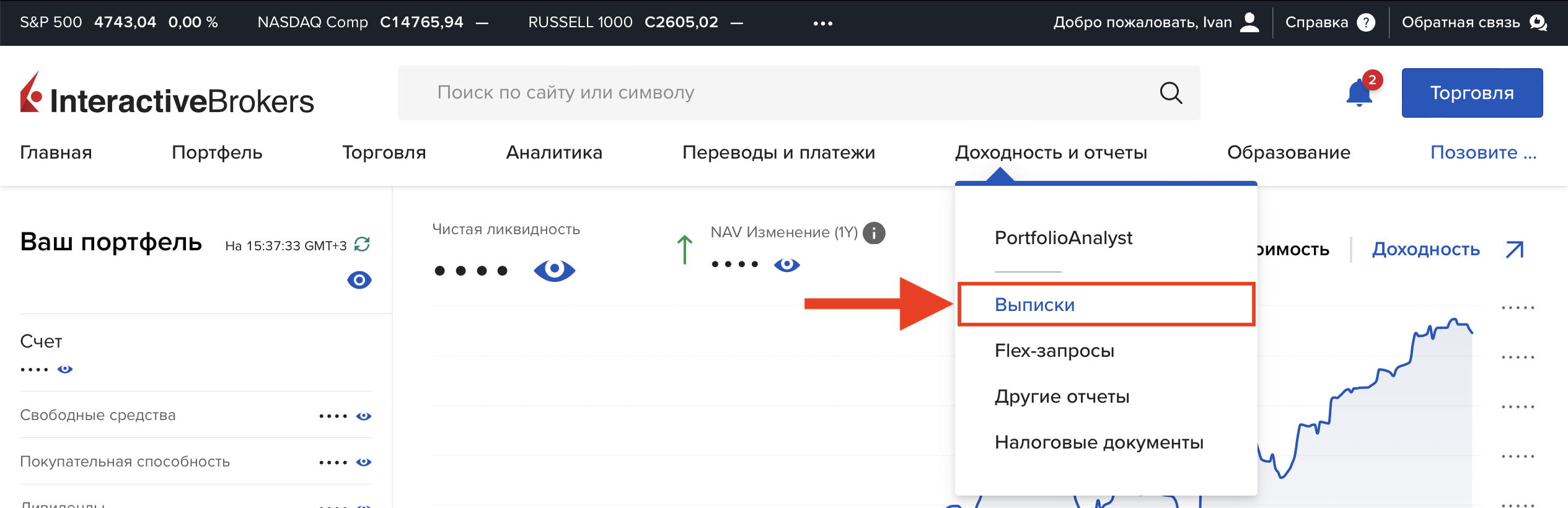 Нажмите на пункт меню «Доходность и отчеты» («Performance & Reports»), а затем в открывшемся меню нажмите на пункт «Выписки» («Statements»).