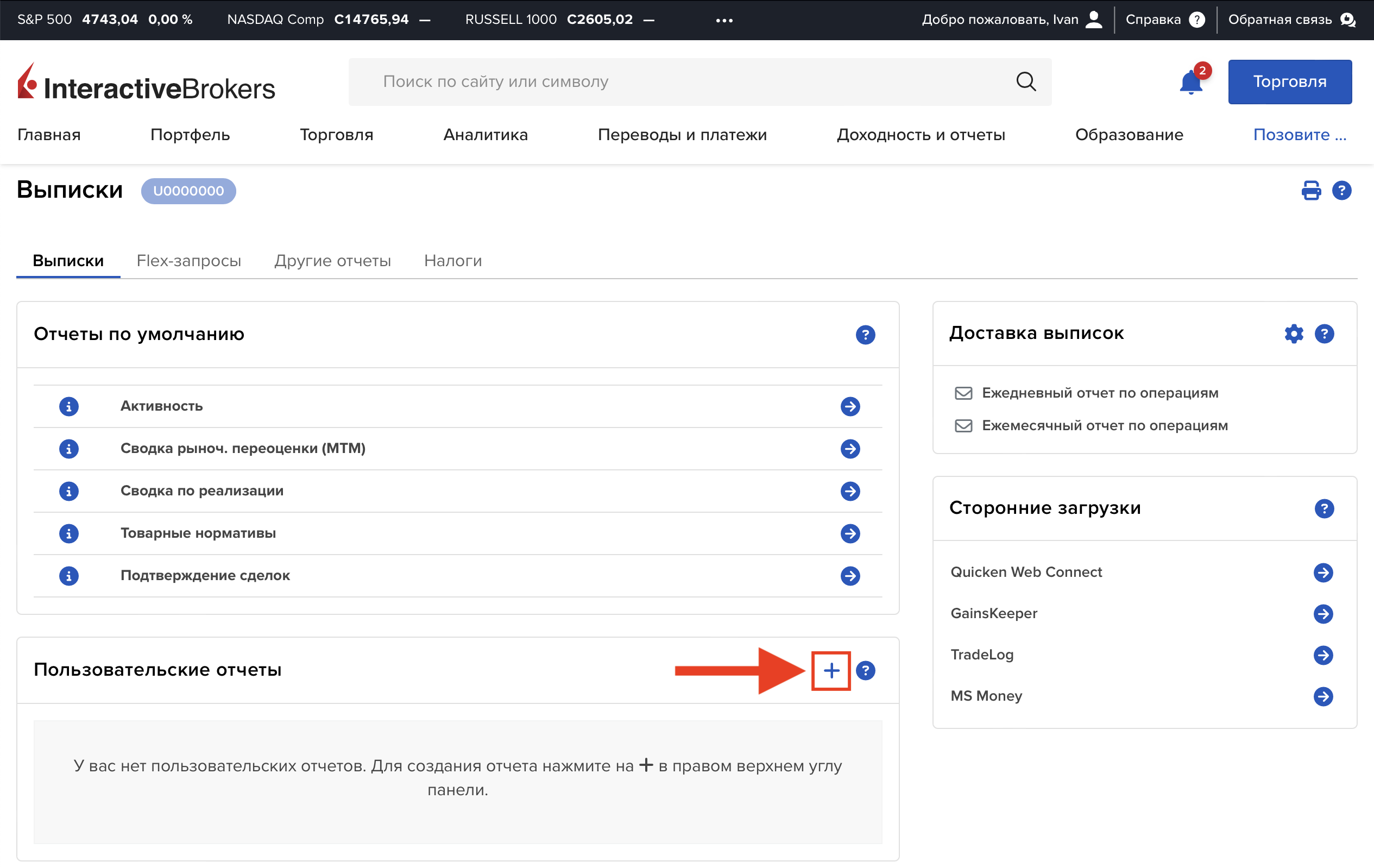 В блоке «Пользовательские отчеты» («Custom Statements») нажмите на иконку «+» (плюс).