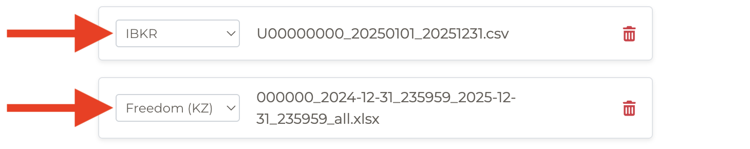 После добавления файлов убедитесь, что для каждого из них верно указан брокер. При необходимости измените его в выпадающем списке рядом с названием файла.