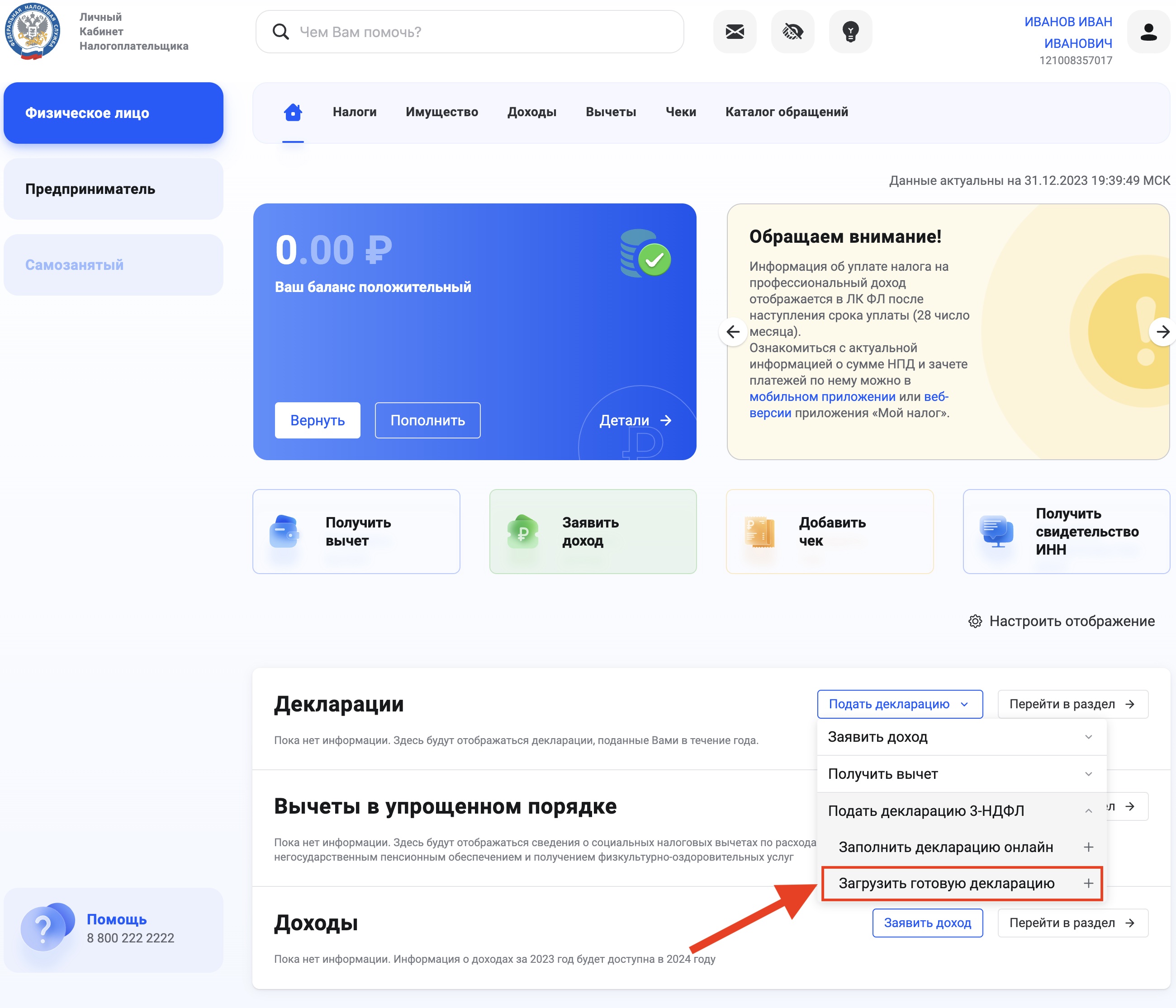 в дополнительно появившихся пунктах нажмите на пункт «Загрузить готовую декларацию».