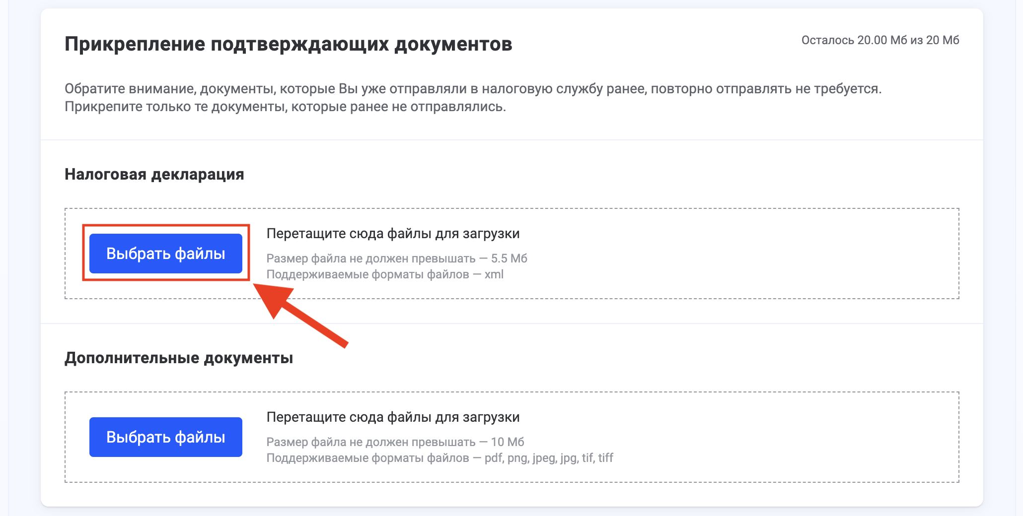 Нажмите на кнопку «Выбрать файлы» в блоке «Налоговая декларация» и загрузите